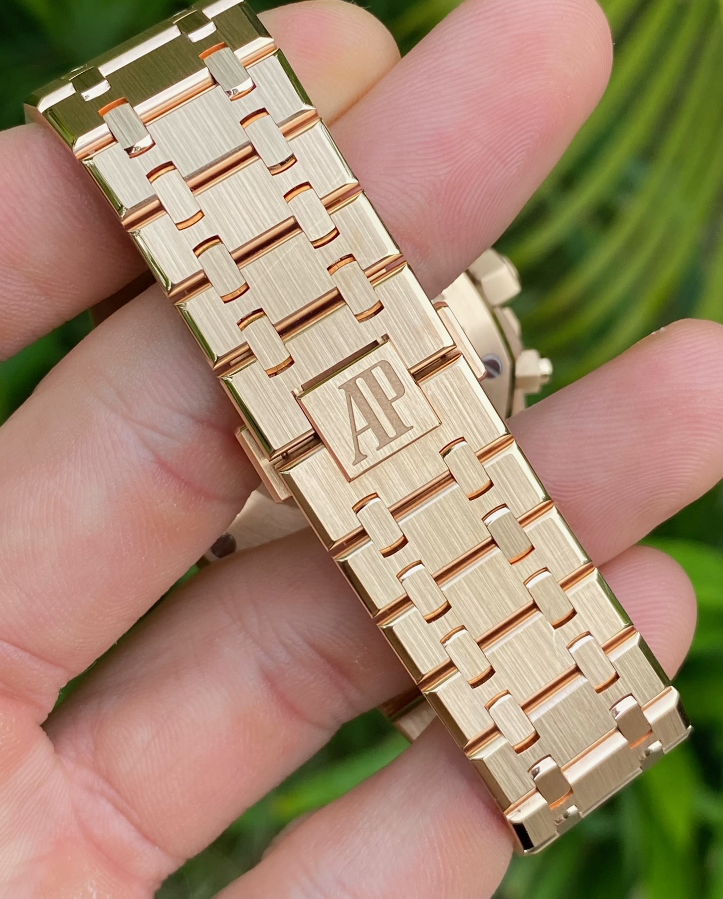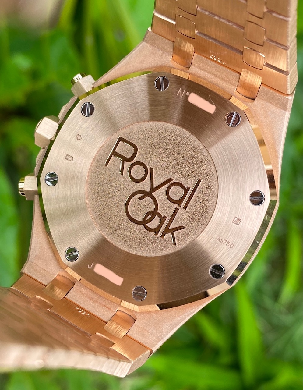 Audemars Piguet Royal Oak 26320OR Chronograph Full Rose Gold Black Dial เป็นนาฬิกาที่มีความหรูหราและสวยงาม ซึ่งทำให้มีความนิยมอย่างมากในวงการนาฬิกา นี่คือคุณสมบัติและเหตุผลที่ทำให้คนมองหาและซื้อนาฬิกานี้ ความแม่นยำและเทคโนโลยีสูง: Royal Oak 26320OR Chronograph มาพร้อมกับเครื่องยนต์ Caliber 2385 ที่เป็นเครื่องยนต์อัตโนมัติที่มีความแม่นยำและเทคโนโลยีสูง ฟังก์ชันการจับเวลาครอนโทกราฟและวันที่มีอยู่เพื่อให้คุณสามารถใช้งานได้อย่างสะดวกและแม่นยำ ดีไซน์ที่โดดเด่น: Royal Oak 26320OR Chronograph มีดีไซน์ที่เป็นเอกลักษณ์และมีความสวยงาม มีเครื่องยนต์ตั้งฉากด้วยดีลตรงเหลี่ยมและซับซ้อน และมีตัวเลขหรือเส้นด้ายทรงตัวเลขตรงสี่เหลี่ยมที่เป็นลายลักษณ์อักษร “Grande Tapisserie” นี่เป็นดีไซน์ที่แสดงถึงความเป็นเอกลักษณ์และความเป็นผู้นำของ Audemars Piguet วัสดุคุณภาพสูง: นาฬิกา Royal Oak 26320OR Chronograph ทำจากทองคำสีเหลืองแท้ (18K) ซึ่งเป็นวัสดุที่มีคุณภาพสูงและมีความหรูหรา การใช้ทองคำสีเหลืองแท้ทำให้นาฬิกาดูมีเงาและเปล่งประกาย นาฬิกา Audemars Piguet Royal Oak 26320OR Chronograph Full Rose Gold Black Dial เป็นนาฬิกาที่น่าสะสมเนื่องจากสาเหตุต่อไปนี้: ความเป็นเอกลักษณ์: Royal Oak 26320OR Chronograph เป็นส่วนหนึ่งของคอลเลกชัน Royal Oak ที่มีดีไซน์ที่เป็นเอกลักษณ์และได้รับความนิยมอย่างมากในวงการนาฬิกา การเป็นเจ้าของนาฬิกาที่มีความเป็นเอกลักษณ์อาจทำให้คุณรู้สึกเป็นเจ้าของสิ่งที่พิเศษและหลากหลาย ความหรูหราและคุณภาพสูง: นาฬิกาที่ทำจากทองคำสีเหลืองแท้ (18K) มีความหรูหราและคุณภาพสูง การลงทุนในนาฬิกาที่มีคุณภาพสูงสามารถให้คุณสามารถเพิ่มมูลค่าและความเป็นคุ้มค่าในอนาคตได้ ความนิยมและความแรงกล้า: Audemars Piguet Royal Oak เป็นแบรนด์ที่มีชื่อเสียงและมีตำนานในวงการนาฬิกา การเป็นเจ้าของนาฬิกาจากแบรนด์เหล่านี้อาจเสนอความนิยมและความพิเศษให้กับคุณ นอกจากนี้ Royal Oak 26320OR Chronograph ยังเป็นรุ่นพิเศษที่สร้างขึ้นเพื่อเฉลิมฉลองครบรอบ 50 ปีของ Royal Oak ซึ่งอาจทำให้มีความคาดหวังในเรื่องของการลงทุนในอนาคต