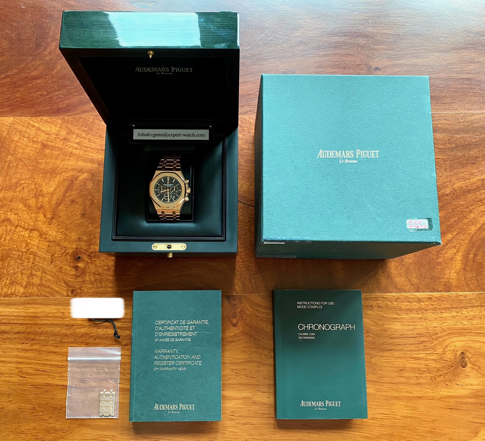 ทาง thehorologymovement เป็นตัวแทนจัดจำหน่าย นาฬิกา Audemars Piguet Royal Oak 26320or Chronograph Full rose gold black diall มือสอง ทุกเรือนได้ผ่านการตรวจสอบยืนยันทางเอกสารว่าเป็นสินค้าแท้ มีประกันทุกเรือน พร้อมกันส่งหรือนัดรับได้ในทุกพื้นที่ใกล้เคียง เราการันตีลูกค้าในมือกว่า 300 รายที่มั่นใจ เลือกซื้อนาฬิกาหรูมือสองกับเรา